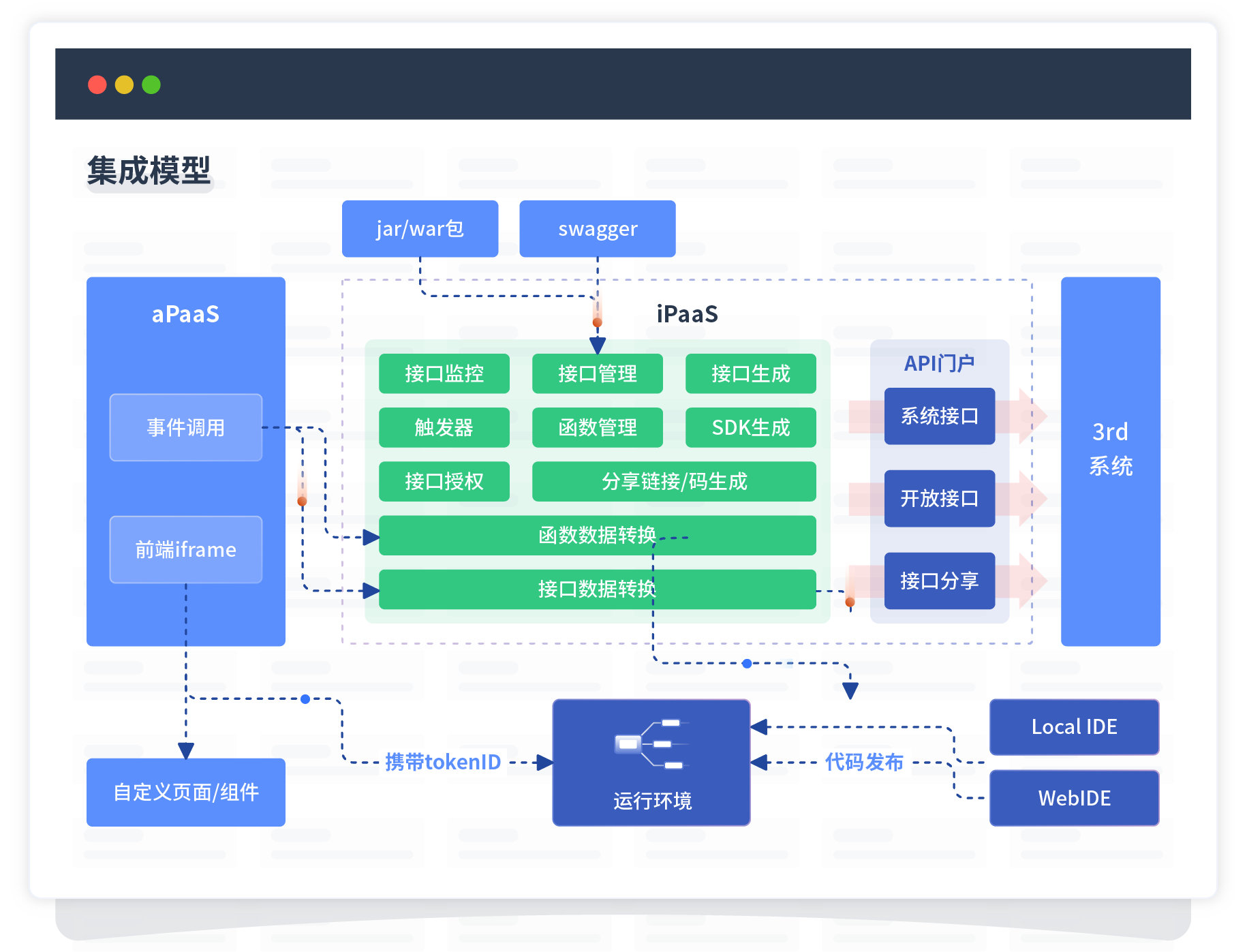集成模型包括平台本身前、、、、、、、后端能力的扩展,,,,,,,,,,,也支持通过API门户和第三方系统进行交互。。。。。。。。。。。