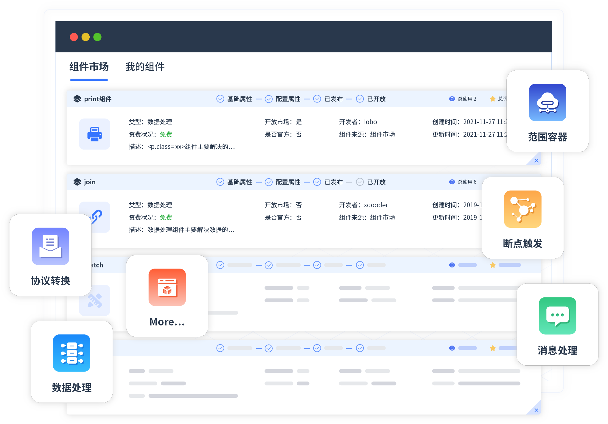 针对集成场景,,,,,,,,,,,华为钱包提供组件市场,,,,,,,例如协议转换、、、、、、、、、、消息处理、、、、、、、、文件操作等。。。。。。。。。。。除平台提供的组件外,,,,客户可以自定义所需组件。。。。。。。。。。。