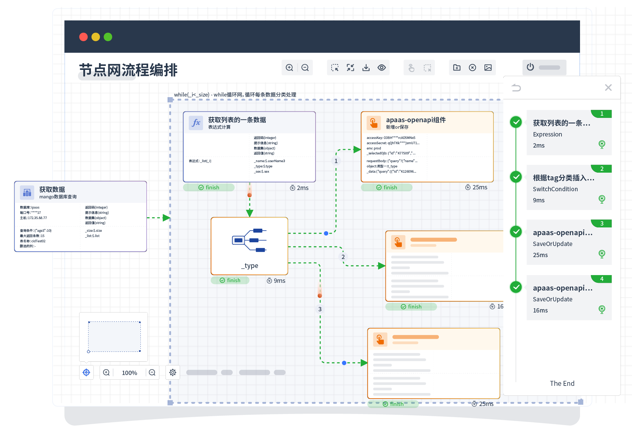 针对集成场景,,,,,组件定义后支持进行流程编制,,,,,,,,,,不同于传统代码方式,,,,,,,,通过图形化展示,,,,,,,,支持在线调试、、、、、、、日志查看和运行回放。。。。。。。。。